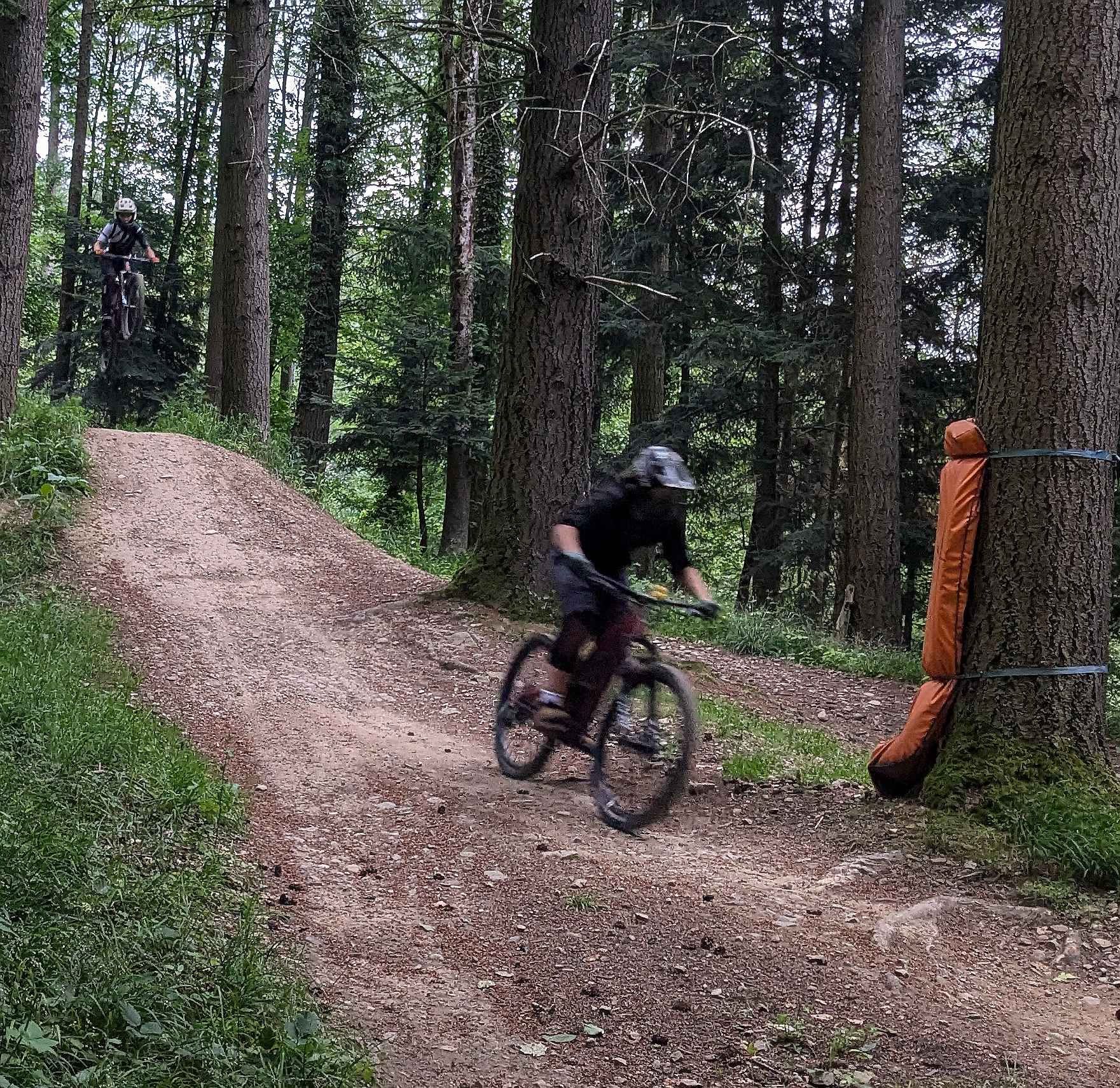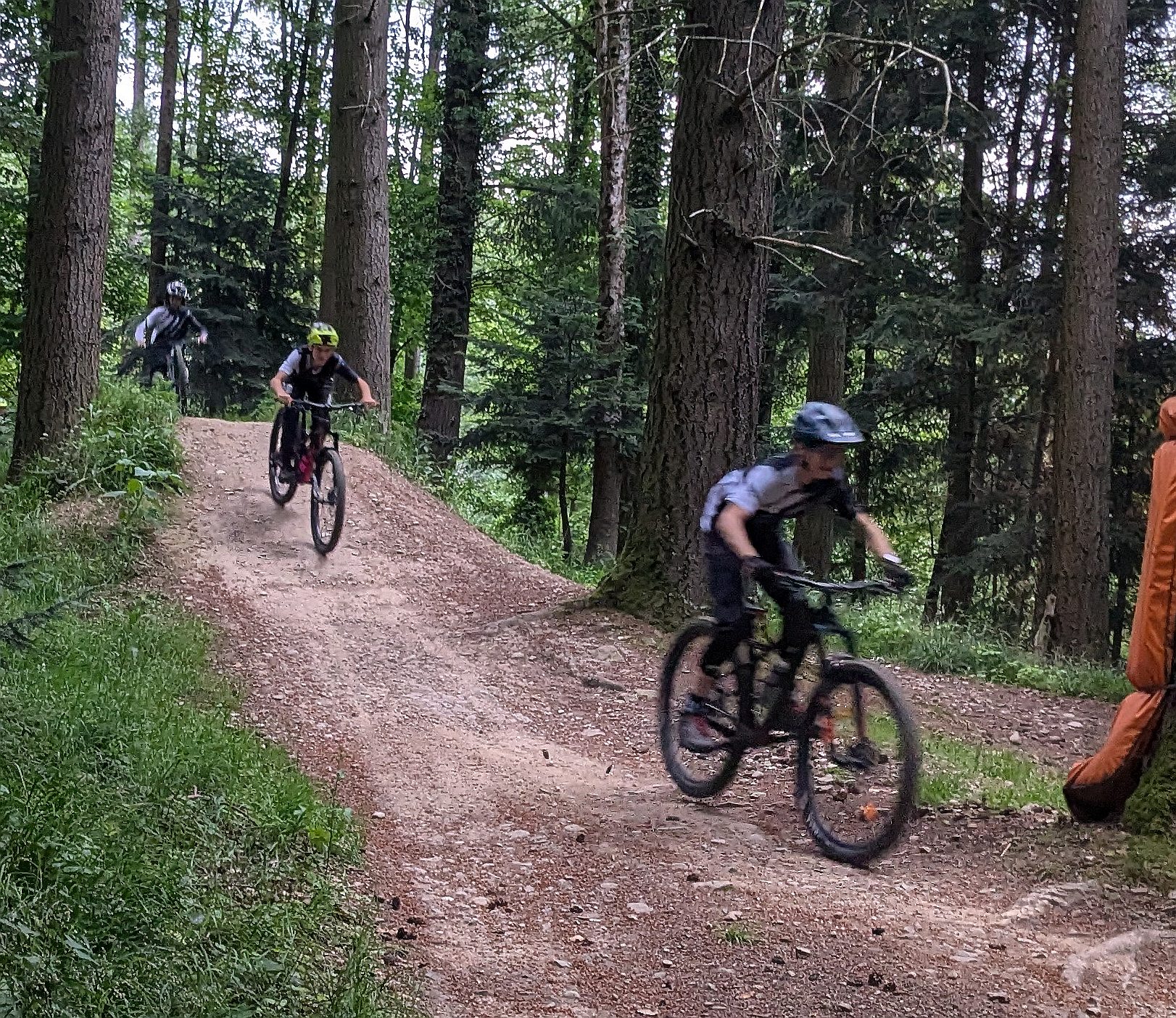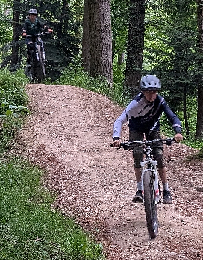 Nicht ganz so einfach war es, die Kids auf gegenseitigen Abstand zu bringen. Der Ehrgeiz und Elan waren entsprechend hoch. So lernten manche schnell, dass Überholen auf den Trails fast unmöglich ist und man seine Fahrt entsprechend verlangsamen muss. Doch rasch hatten sich schnell und weniger schnell sortiert, fuhren aber zum Leidwesen der Trainer immer noch zu dicht auf. Auch „lautes“ darauf hinweisen erreichte die Kids in ihrem Tatendrang nicht mehr. So beschlossen wir vor jeder Sektion die Fahrer*in nur noch mit Einzelfreigabe auf den Trail zu lassen. Gut eingestimmt wussten nun alle was sie die nächsten beiden Tage erwartete.