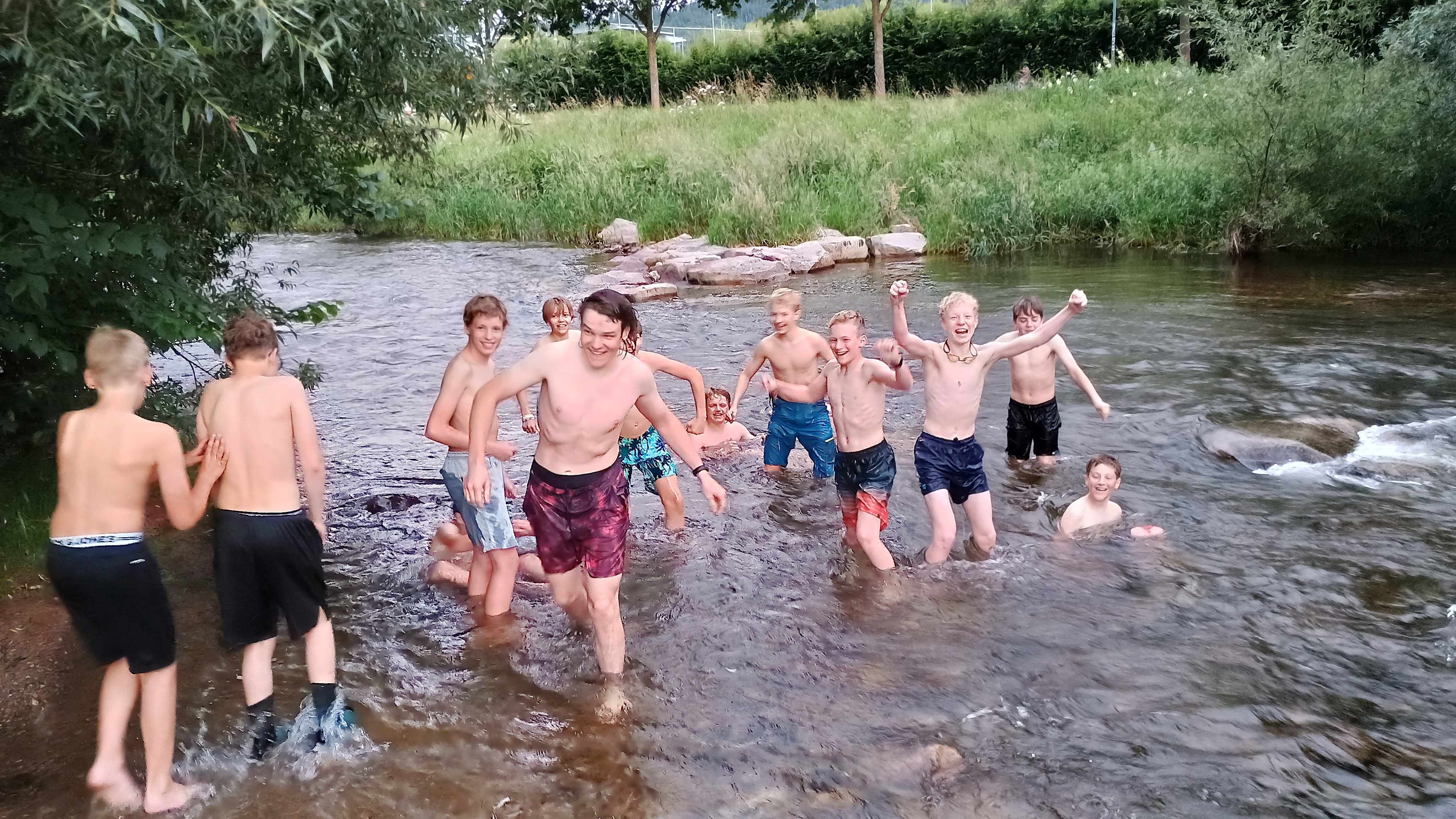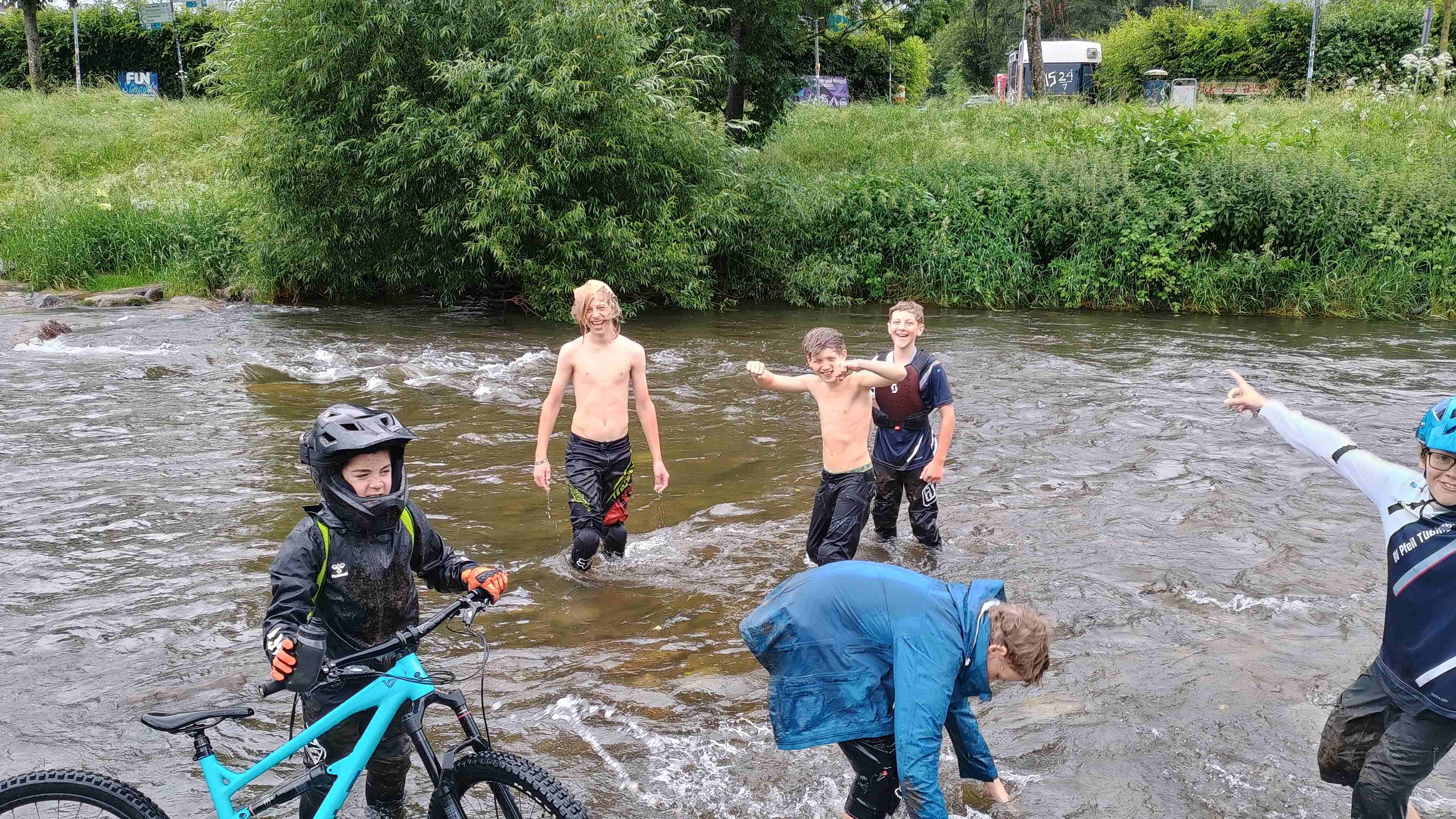 Tag 2: Nach dem Frühstück und Lunchpakete richten wurden die Bikes in die Fahrzeuge und Hänger verladen um alle kräfteschonend die 1000hm auf den Schauinsland zu befördern, wollten wir doch von dort via Badish Moon Rising zum Canadian-Trail gelangen. Schon die ersten Trails zum BMR zeigten, dass auch die Downhills ordentlich an den Kräften zehren und hochkonzentriert gefahren werden müssen. Leider wurde das durch einen heftigen Sturz und einigen Reifendefekten quittiert. Und da das noch nicht reichte, bekamen wir zusätzlich noch eine Extremdusche ab, welche die Trails in kleine Bäche verwandelte. Doch auch dieser Zustand tat der guten Stimmung keinen Abbruch, manche fanden es sogar ganz witzig in einem „Bach“ abzufahren, Abenteuer pur. Die Trails im Schwarzwald sind allerdings auch im nassen Zustand deutlich griffiger als bei uns. Über den BMR gelangten wir schließlich zum Canadian wo uns 3,1km auf 501 Tiefenmeter (Gefälle Ø 16,2%) bevorstanden. Das erforderte nochmals volle Konzentration und manches Material kam an seine Grenzen, hat aber trotz allem richtig Spaß gemacht. Unten angekommen beschlossen wir zur Juhe zurück zu fahren, nicht ohne komplett verdreckt noch einen Vollwaschgang in der Dreisam einzulegen. Jeder der mit Jugendgruppen zu tun hat, kann sich vorstellen was dann dabei abging 😉.