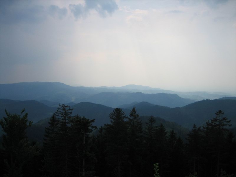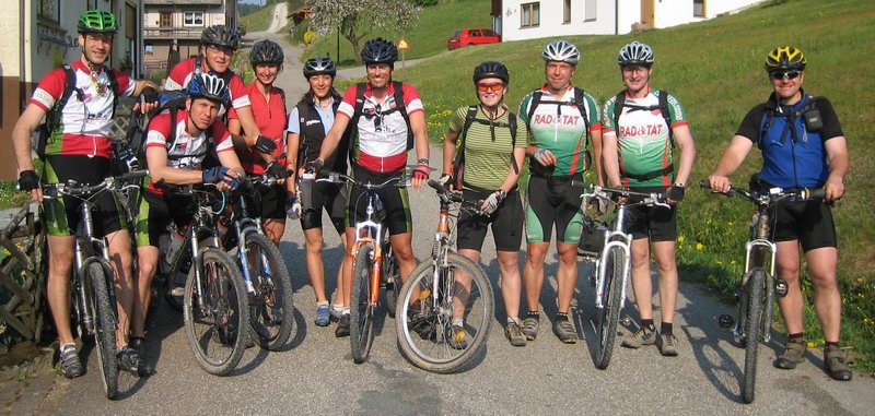 Doch kaum sind wir endlich oben, realisiert sich die schon lang drohende Unwettergefahr. Gerade als wir auf den Panoramaweg zum Schliffkopf auffahren, entlädt sich das Gewitter. Zerrissen in verschiedene Kleingruppen und teilweise ohne Regenschutz (aha, da war doch was), versuchen die Hinteren erstmal überhaupt den Weg in Richtung Schliffkopf zu finden und dann, diesen auch zu erreichen. Zwischen Blitz und Donner („der Blitz ist 100 Meter entfernt eingeschlagen“) düsen wir knapp unterhalb des Gipfelkammes ohne wirkliche Orientierung den Wanderweg entlang. Glücklicherweise erreichen bald alle, auch die solo fahrende Karen, den trocken gebliebenen „tete de la course“, der schon bei Currywurst und Cola in einem Gasthaus auf dem Ruhesitz wartet.