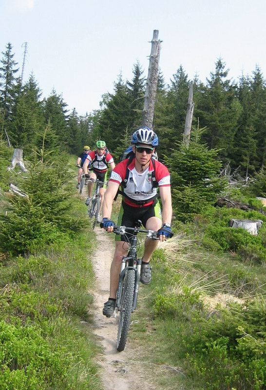Da es trotz allem noch recht früh ist, beschließen wir, weiter nach Westen zu fahren. Nach einer trickreichen Trailabfahrt vorbei am Verlobungsfelsen durchqueren wir das Murgtal und pedalieren anstrengende 600 Höhenmeter aufwärts entlang eines Bachlaufes bis auf die Hornisgrinde.