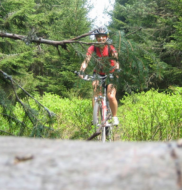 Hier erwartet uns ein wirkliches Highlight; 4 ½ Kilometer bemooster Trail ohne nennenswerte Höhendifferenz, technisch anspruchsvoll, gut zu fahren – einfach super! Thomas mit seinem Fully zieht allen davon und als man sich am Ende wieder sammelt, fährt Becky im Stehen. Die Sattelaufnahme an ihrem Magnesiumrahmen ist abgebrochen! Notdürftig können wir den Sattel fixieren, aber fahren kann man mit dem Rad eigentlich nicht mehr. Droht eine weitere Dezimierung des Fahrerfeldes?