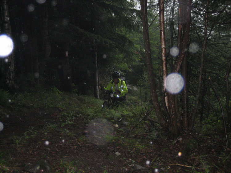 Von Termignon folgen wir der alten Höhenstraße nach Modane. Ab hier beginnt ein Abenteuer der besonderen Art: Mit einer Maximalsteigung von 160 % schrauben wir uns in Matsch und Regen, der Wegmarkierung „GR5“ folgend im Val Fréjus zum Vallée Etroite hinauf. Um zum Col de la Vallée Etroite (2.445 m) zu kommen, fahren und schieben wir auf zum Teil steilster Militärpiste und später auf weitgehend fahrbarem Trail hinüber nach Italien. Für Downhiller bestens geeignete Strecken bringen uns über Refuge Maggi (1.765 m) bis hinunter in den Olympiastandort Bardonecchia. Nach einer kurzen Rast mit Cacao und Pizza fahren Boris und Klaus in Andreas Hinterreifen-Dauerdusche (Albert lässt grüßen) über Oulx hinauf nach Fenils (1.300 m). Glücklicherweise finden wir hier Quartier in einem Agritourisme-Bauernhof und für den langen Abend eine adäquate Pizzaria wo wir zum Trost die gesamte Speise- und Getränkekarte durchprobierten.