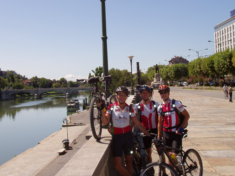 Um eine gleichmäßige Abnutzung des Ritzelpaketes zu gewährleisten, ging es auf dem 11er Ritzel in hohem Tempo leicht bergab nach Chiomonte. Von dort mit der Bahn nach Turin zu einer ausgiebigen Stadtrundfahrt mit Mittagessen. Am Nachmittag brachte uns die italienische Bahn „Trenitalia“ entlang des Ortasees mit schönen Blicken zum Monte Rosa nach Villadossola (280 m) am Alpenhauptkamm. Trotz der entsetzten Gesichter der ansässigen Bevölkerung nehmen wir den Anstieg zum Lago di Antrona (1.073 m) in Angriff und finden dort tatsächlich Unterkunft in der einzigen Hütte. Das Abendessen war sowohl vielseitig wie reichhaltig, außerdem bekommen wir detailliertes Kartenmaterial über unser Expeditionsgebiet.