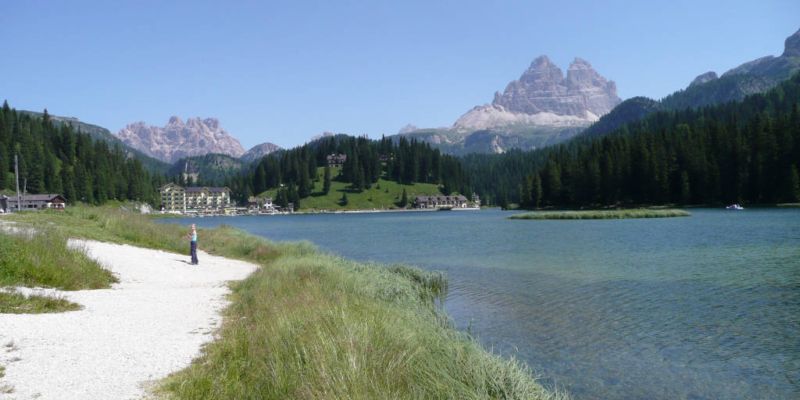 ![]() Am Fedaiasee mit den Schneefeldern der Marmolada (3340 m, höchster Gipfel der Dolomiten) |