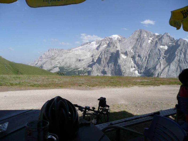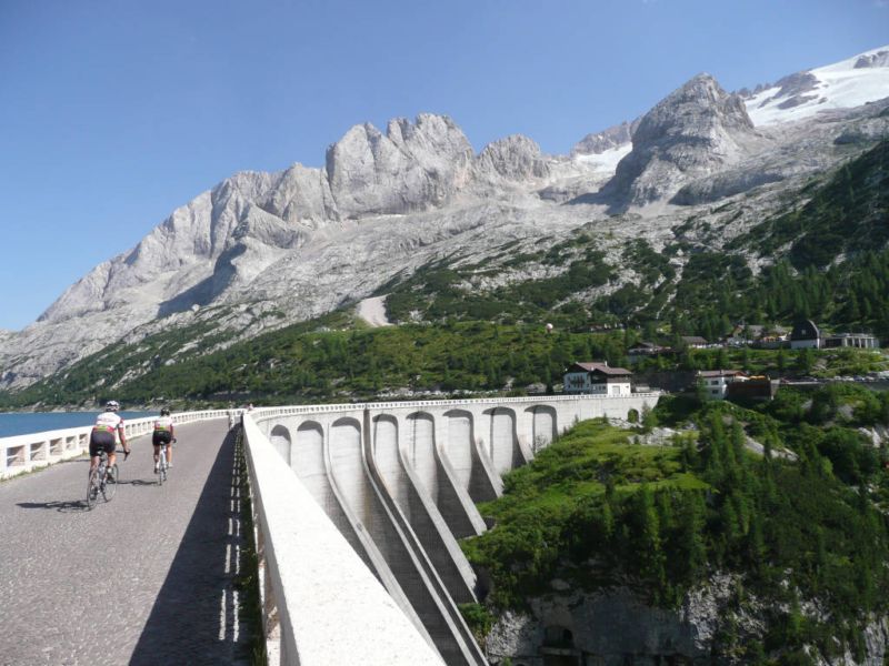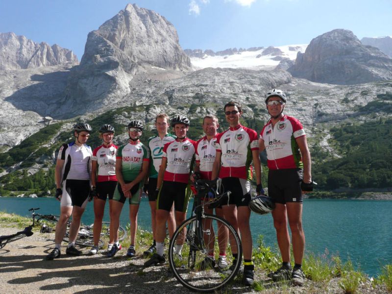 Am Gipfel fuhren wir dann zusammen zum Stausee Lago di Fedaia, wo wir die herrliche Aussicht auf den mit Gletschern bedeckten Marmolada genossen.