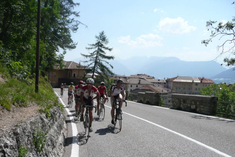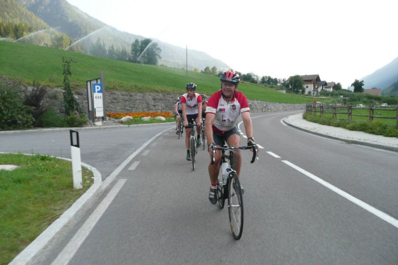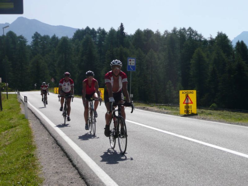 Nach der Verpflegung ging es den Mendelpass hinauf welcher zwar lang ist aber keine sonderlichen Steigungen aufweist. Schon bei der Abfahrt von der Verpflegungsstelle ereilte unseren Pannenkönig Friedhelm das Pech und er musste den Anstieg mit 7 Minuten Rückstand in Angriff nehmen.