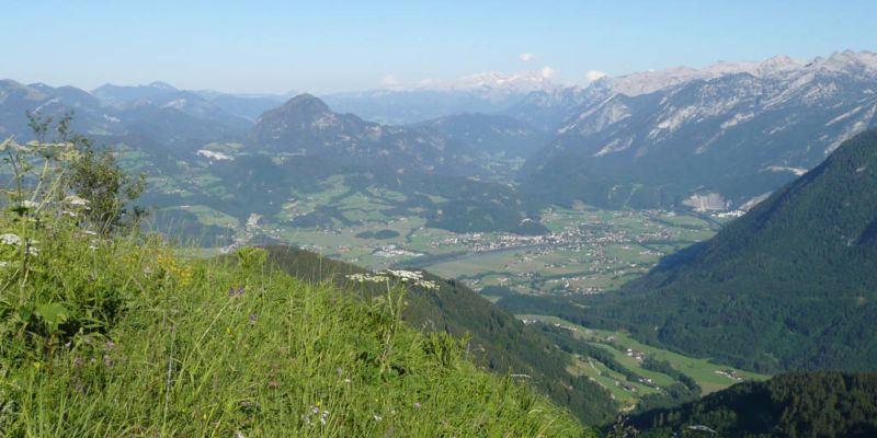 ![]() Von oben sehen wir schon das über 1000m weiter unten liegende Etappenziel Golling, hinten der Dachstein |