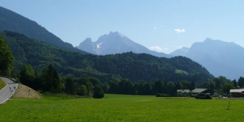 ![]() Ganz links die Straße zum Obersalzberg, in der Mitte der Watzmann und rechts der Hochkalter |