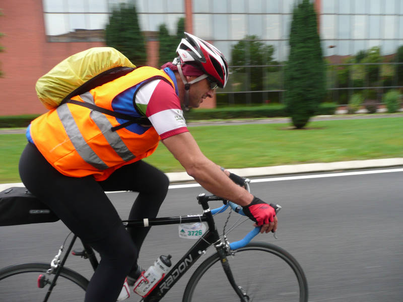 Aber ich bin bereits vor 5 Uhr schon wieder wach, vielleicht weil ich die Ankunft von Georg nicht verpassen möchte, aber er ist erst um 5:41 Uhr an der Kontrollstelle in Dreux. Um 9 Uhr fahre ich ihm dann entgegen, wobei ich wegen dem teils bepflanzten Mittelstreifen aufpassen muß, ihn nicht zu verpassen. Nach etwa 10 Kilometern warte ich etwas länger als gedacht, bis er dann auftaucht. Die letzten 10 Kilometer bis ins Ziel fahre ich jetzt nochmal zusammen mit Georg. Er berichtet mir schon kurz von seinen Problemen, dass er nach der Anfangsphase nur noch im Sitzen fahren konnte.