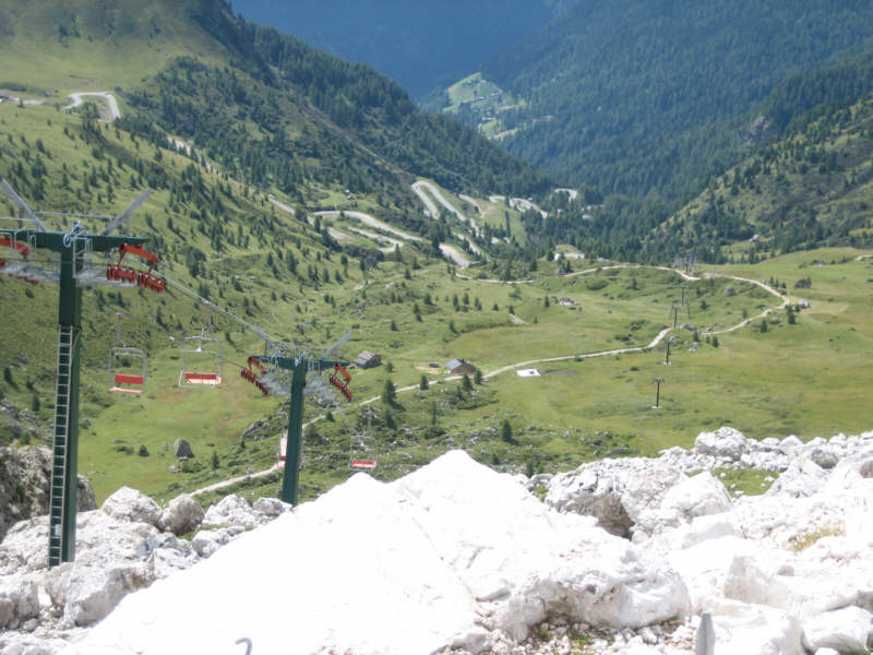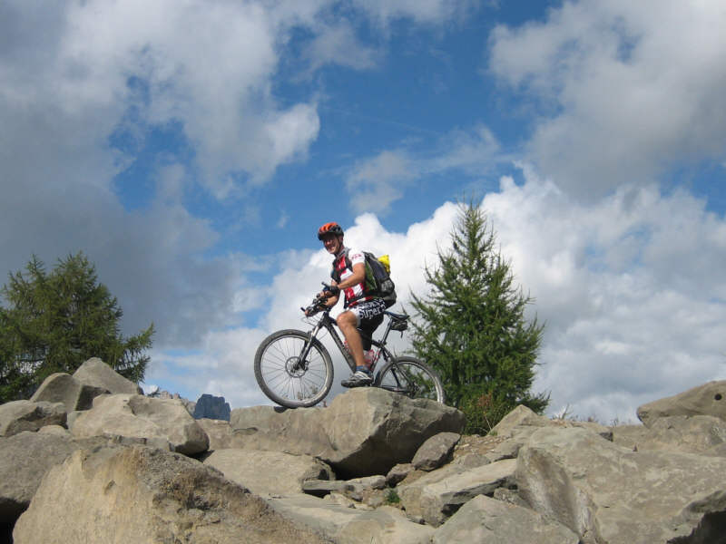 Die Abfahrt über kindskopfgroße Schottersteine verläuft nicht ganz verschleißfrei: Ein Schlauch und eine Radhose waren als Opfer zu beklagen. Nach der Siesta in Selva di Cadore geht es auf Waldautobahnen bis zur Liftstation am Monte Fernazza.
