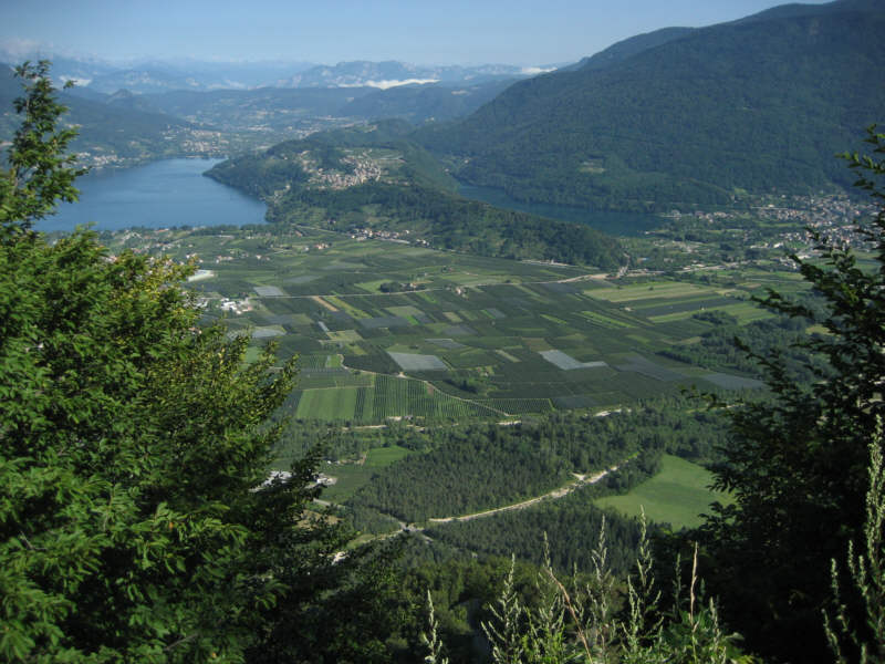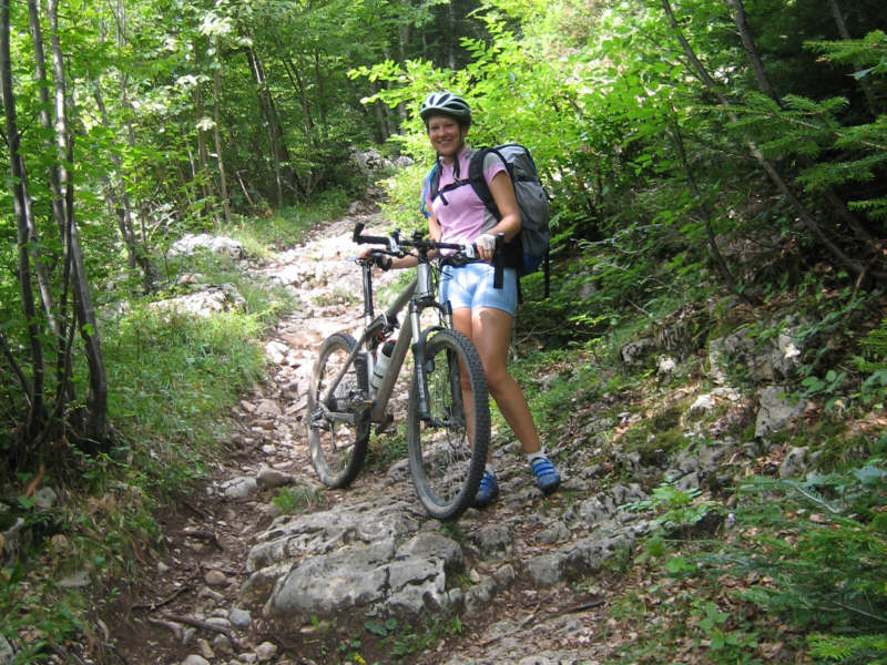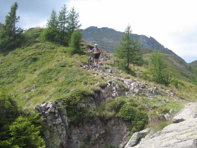 Hier gibt's auf fahrbarer Terasse Pasta für zwischendurch. Es folgt eine Ehrenrunde auf dem örtlichen Trimm-Dich-Pfad. Über den Passo Sommo erreichen wir Folgaria. Hier trennt sich die Gruppe: Achim fährt direkt nach Rovereto und kümmert sich um Unterkunft. Katja und Andreas machen noch einen landschaftlich reizvollen Umweg und erklimmen den Monte Finonchio, um danach über einen Wanderweg nach Rovereto abzufahren. Der Wanderweg hat es in sich: Grobschotter, gewachsener Fels und Wurzeln wechseln sich ab. Nachdem bereits 700 hm erfolgreich in Wärme umgewandelt sind, steigt die Strecke wieder an, um noch einen weiteren Trail auf Grobschotter mit Stufen zu ermöglichen. Hier trennt sich die Gruppe ein weiteres Mal: Andreas findet, dass sein Rad eine etwas größere Stufe auch gut ohne ihn abfahren könnte. Nachdem Lenker und Vorderrad wieder einen rechten Winkel bilden, geht es weiter.