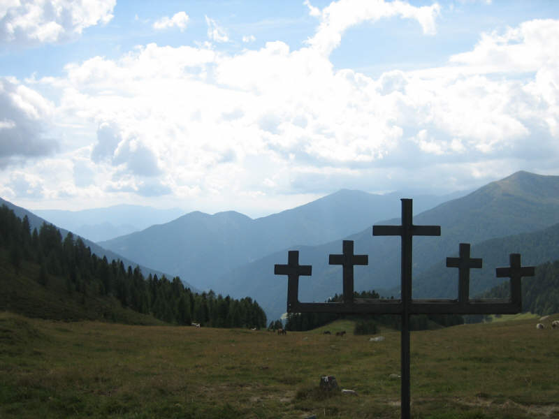 Sonne pur in Molina di Fiemme. Einrollen auf Asphalt den Manghen-Pass hinauf. Bis zur Malga Cazzorga auf mehr oder weniger steilem Schotter. Ab hier setzt sich Schieben und Tragen als vorrangige Fortbewegungsart mit Bike durch. Auch das Erreichen der Passhöhe Forcella di Valsorda ändert daran wenig.