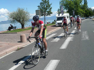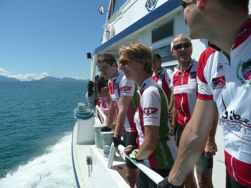 Sehr pünktlich gegen 11 Uhr erreichen wir Lausanne. Ein Studienfreund von Tobias stellt uns netterweise Parkplätze für zwei der Autos zur Verfügung. Es wird abgeladen, sich umgezogen, gegessen, Trinkflaschen befüllt und dann machen sich 12 Radler auf zum Genfer See. Thomas und Friedhelm übernehmen jeweils ein Auto und kaufen für die erste Verpflegung nach 55 km ein.