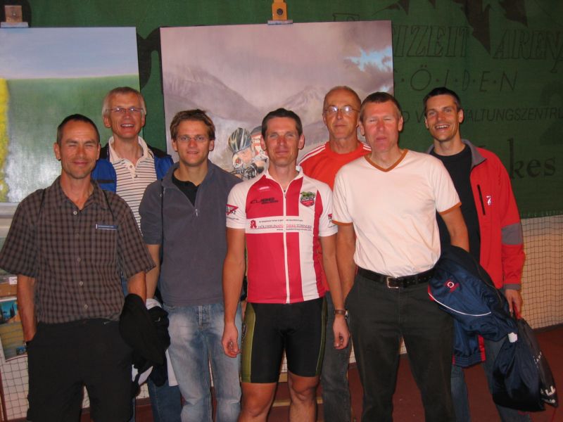 Georg Fenzke, Michael Stempel, Steffen Warrias, Bernd Geiser, Uwe Vorbeck, Andreas Koch, Klaus Greif, Karen Petersen) darunter zwei Gastfahrer aus Hamburg, zur Registrierung beim Ötztal- Radmarathon an.