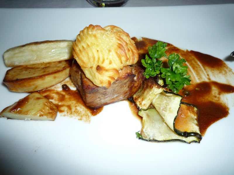 | Erstes italienisches Mittagessen im Feinschmeckerlokal (Geheimtipp bei Chiavenna): Vitello, ansprechend dargeboten | ![]() |