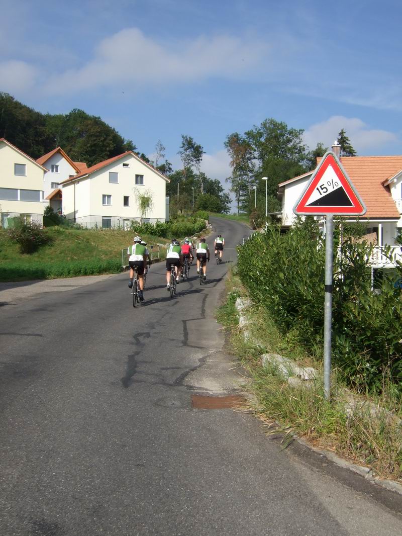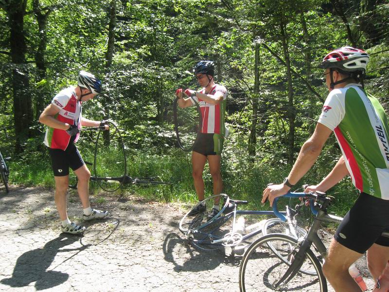 Nach der reichhaltigen Verpflegung wechselten Georg und ich auf die Rennmaschinen und Martin sowie Andreas durften ans Steuer der Boliden. Die Strecke führte uns über eine sehr, sehr schlechte Strasse bei der uns klar wurde warum der Armin so denn er mit wäre sein Trekkingrad genommen hätte. Beim Hinauffahren hatten wir dann auch die zwei einzigen Platten der Tour, was bei den 1000 Schlaglöchern und Kieswegpavées nicht verwunderlich war.