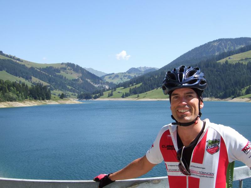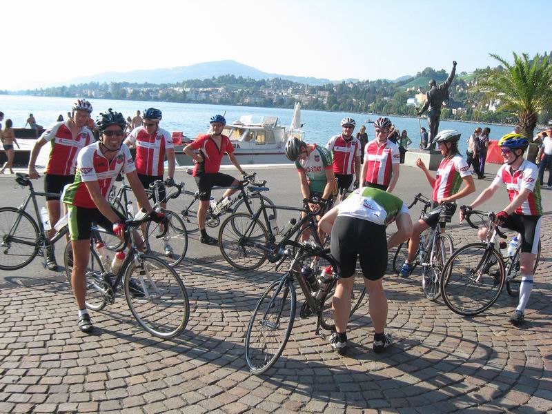 Wir brauchten nun nur noch abzufahren dann noch ein kleines Stück im Rhônetal entlang und dann war Montreux schon erreicht. Auf der Abfahrt begegneten uns Martin und Andreas diesmal auch wieder mit dem Radel. Sie waren uns direkt von Montreux entgegen gefahren. Am Zielort angekommen fuhren wir am See in Klaus-Peter-Thaler-Manier entlang (Die älteren Leser dieses Berichtes kennen ihn, die jüngeren wie ich müssen nachfragen). In einem Café am See genossen wir noch die schönen Seiten der französischen Schweiz. Nebenher wurde über bestimmte Personen und Dinge aus längst vergangenen Tagen gesprochen. Ein erster Generationenkonflikt zeichnete sich ab,-). Auf der Fahrt durch die Stadt zurück zur JuHe gab es auch den einzigen Sturz der Alpentour. Aber es verletzte sich glücklicherweise niemand. Wir hoffen noch auf ein Youtube Video zur genauen Aufklärung.