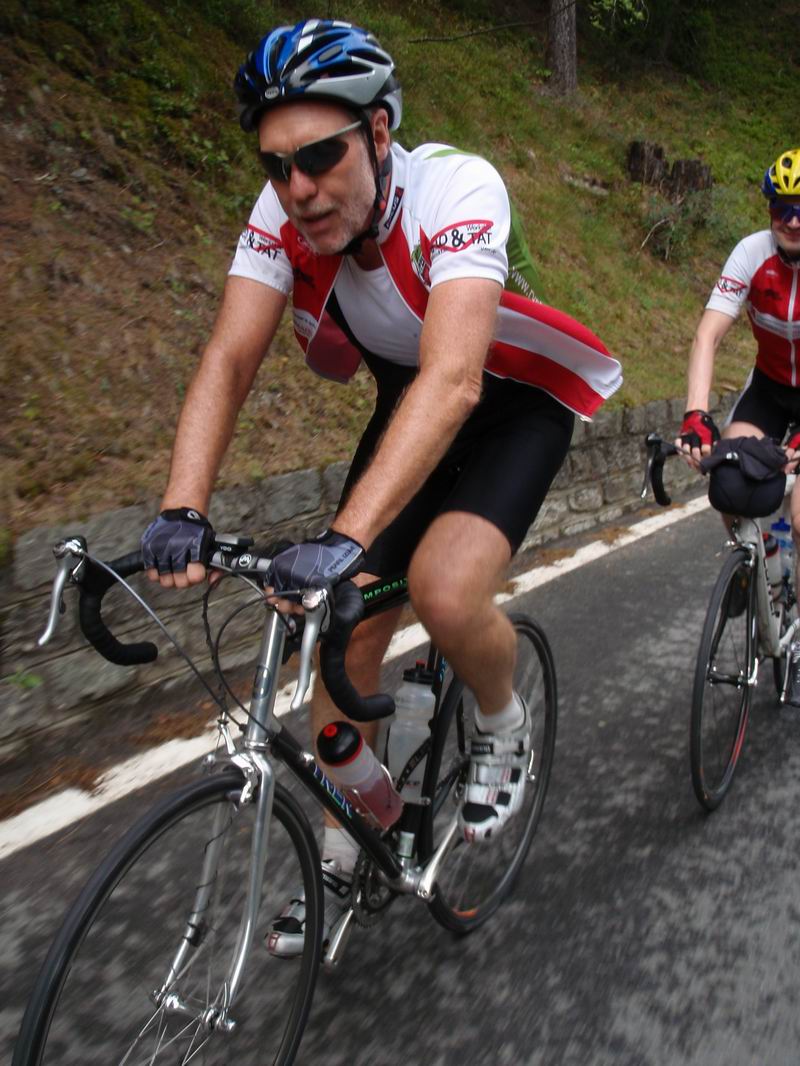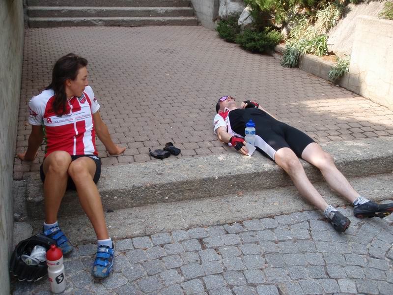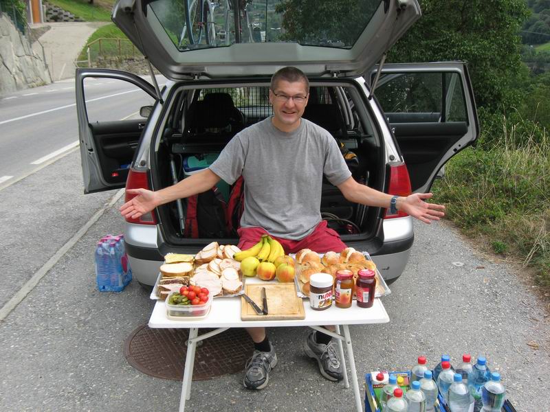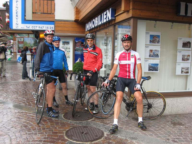 Nach kurzem Rundblick auf die in Wolken gehüllten Berge geht es in die lange Abfahrt. Die recht schmale Straße und vielen Serpentinen erfordern große Aufmerksamkeit. Immer wieder muss man scharf abbremsen. Erst nach der Ortschaft Törbel wird die Straße breiter und man kann es kurzzeitig laufen lassen. Mehrere Spiegel sollen die scharfen Ecken an den Felswänden absichern helfen und den Gegenverkehr sichtbar machen. Am Ortsanfang von Stalden wartet dann die erlösende Verpflegung. Jens und Horst haben gut eingekauft und ordentlich Brötchen geschmiert. Hier unten scheint dann auch endlich kräftig die Sonne und nach der Pause sind auch unsere nassgeschwitzten Trikots wieder trocken.