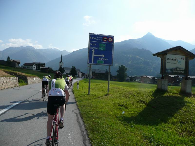 Nach wiederholt unruhigem Schlaf finden wir uns wie am Vorabend zur Massenabfertigung in der Kantine des Sport- und Feriencenter Fiesch (ca. 1000 Betten) bei gewohnter Frühstücksauswahl ein. Heinrich versucht anschließend beim Bezahlen die Rechnung mit dem Grund der nächtlichen Ruhestörungen runterzuhandeln, bleibt aber erfolglos. Wir vertrösten uns mit herrlichem Wetter und fahren fast pünktlich um 9:10 Uhr los, wartet doch heute mit dem Nufenen der höchste innerschweizerische Pass darauf von uns Pfeilern beradelt zu werden.