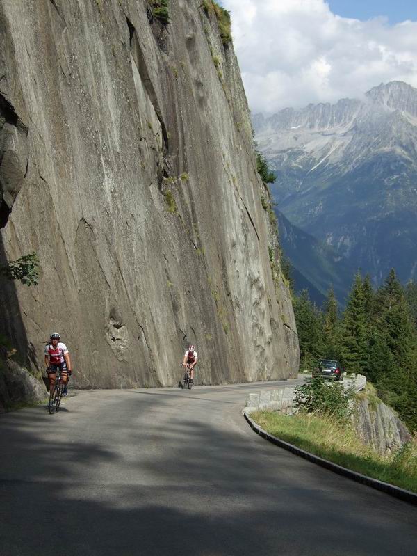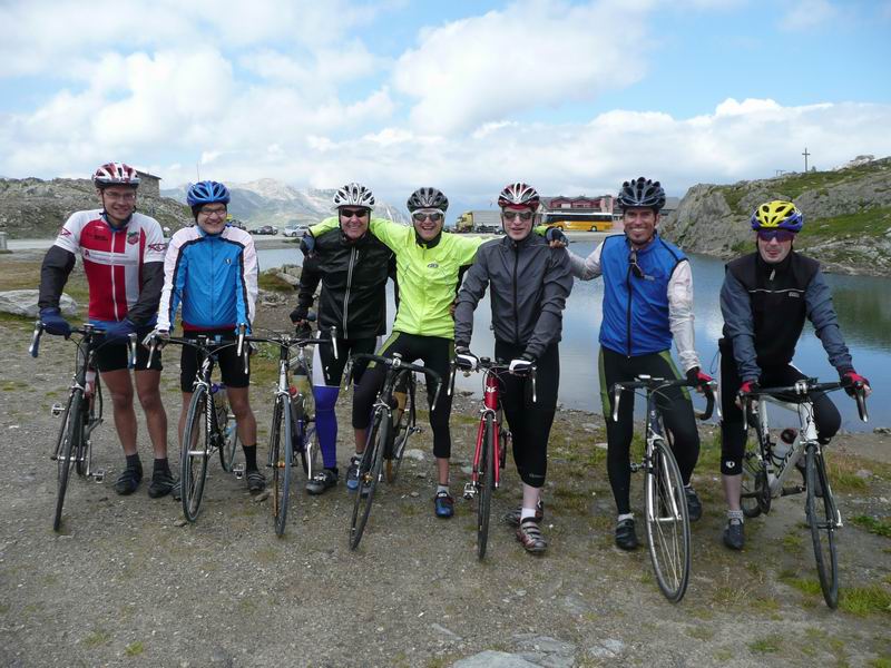 Martin jedoch haut heute mal richtig einen raus und fliegt die alte bepflasterte Poststraße von 1772 hinauf. Wir lassen es ruhiger angehen, rollt es doch eher schlecht. Der Mythos und die vielen Kehren des Val Tremola (Tal des Zitterns) laden vielmehr zum Genießen ein und bei den vielen Abzweigungen zur Bundesstraße kann man sich ja auch mal leicht verfahren.Zitat Steffen: „...Martin, musch au mol im Grupetto fahra, desch isch vei voll endschpannend...“ An der Passhöhe auf 2091 Metern angekommen wartet der große Touristenrummel. Deshalb schnell was von Georgs vorbereiteter Verpflegung genascht, Gruppenfoto und wieder weg hier.