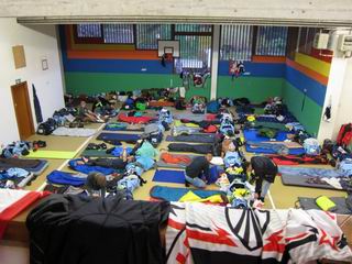 Dankenswerterweise wurden wir von seinen Verwandten am 14. Juli nach Mittenwald gefahren. Der kleiner Ort war schon voller Biker. Die erste Camp-Übernachtung fand in der Turnhalle der Mittenwalder Kaserne statt. Auf der abendlichen Pasta Party im Ort wurde dann vor allem den Ausländern ein Spektakel geboten: Schuhplattler, Blaskapelle und Kinder in Trachtenkleidung, die die Fahnen aller 37 teilnehmenden Nationen hereintrugen.