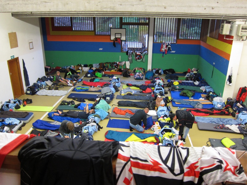Um in den Zielort Alleghe zu kommen, müssen wir noch vollends über den Pass, immerhin weitere 300 HM, von denen die obersten im Gegenwind eiskalt sind. Wegen der Kälte lässt sich die über 1000 HM Abfahrt auf der Straße auch nicht sonderlich genießen, erst unten im Tal wird es wieder erträglich warm. Das per Shuttle Bus erreichbare Camp ist schon nach kurzer Zeit unglaublich verdreckt. Leider haben wir durch die Verkürzung das Sahnestück der Transalp 2011 verpasst, den von Stanciu am Vortag groß angekündigten 16km Single Trail. Auf der Pasta Party erklärt er den Abbruch aber für jeden nachvollziehbar mit dem schlechten Zugang für die Rettungskräfte, da am Trailbeginn auf 2400m Vormittags noch ein Schneesturm tobte.