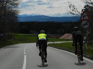 Auf dem Hinweg zum Kloster Andechs haben wir mehrfach Ausblicke auf die Alpen, aber meistens auch Gegenwind, so dass sich weitere Randonneure in den Windschatten der Pfeilfahrer hängen, die letzten Meter zur Stempelstelle am Kloster geht es steil hoch. Nach Verpflegungspause in Herrsching am Ammersee haben wir auf dem Rückweg bis zur letzten Kontrollstelle Neuburg an der Donau (km 270) meistens Rückenwind und Sonnenschein, da macht das Radfahren Spass.