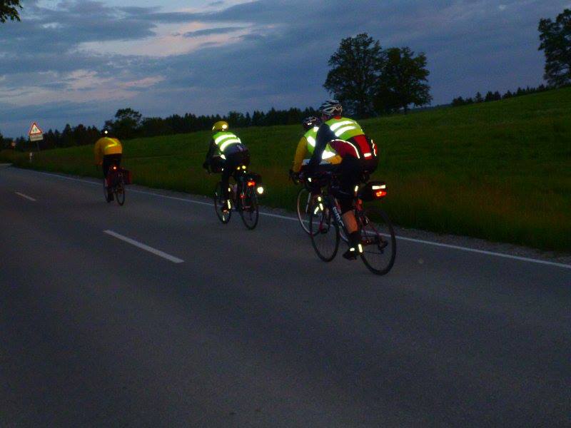 Tatsächlich haben wir bis zur Dämmerung, die wir kurz vor Prien am Chiemsee erleben, ungefähr 280 Kilometer zurückgelegt. Eine sehr ansprechende „schnelle Phase“ mit respektablem Streckengewinn. Während wir unsere Beleuchtung startklar machen und die Warnwesten anziehen, sehen wir über den Bergen schwarze Wolken und ein intensives Wetterleuchten. Wir rechnen mit einer abenteuerlichen Nacht, da uns die Strecke noch weiter in die Voralpen hineinführen wird.