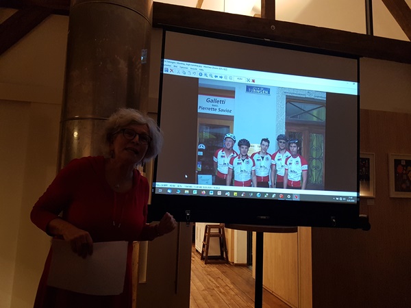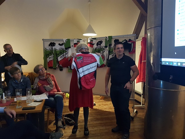 Der Pfeil bedankte sich beim scheidenden Vorsitzenden Armin Huber, der von 2014-2020 dem Verein vorstand und davor auch schon Tourenfachwart, Rennradfachwart, Beisitzer und immer Tourenführer war, mit einem bebilderten Vortrag, einem Trikot und einem Lied
